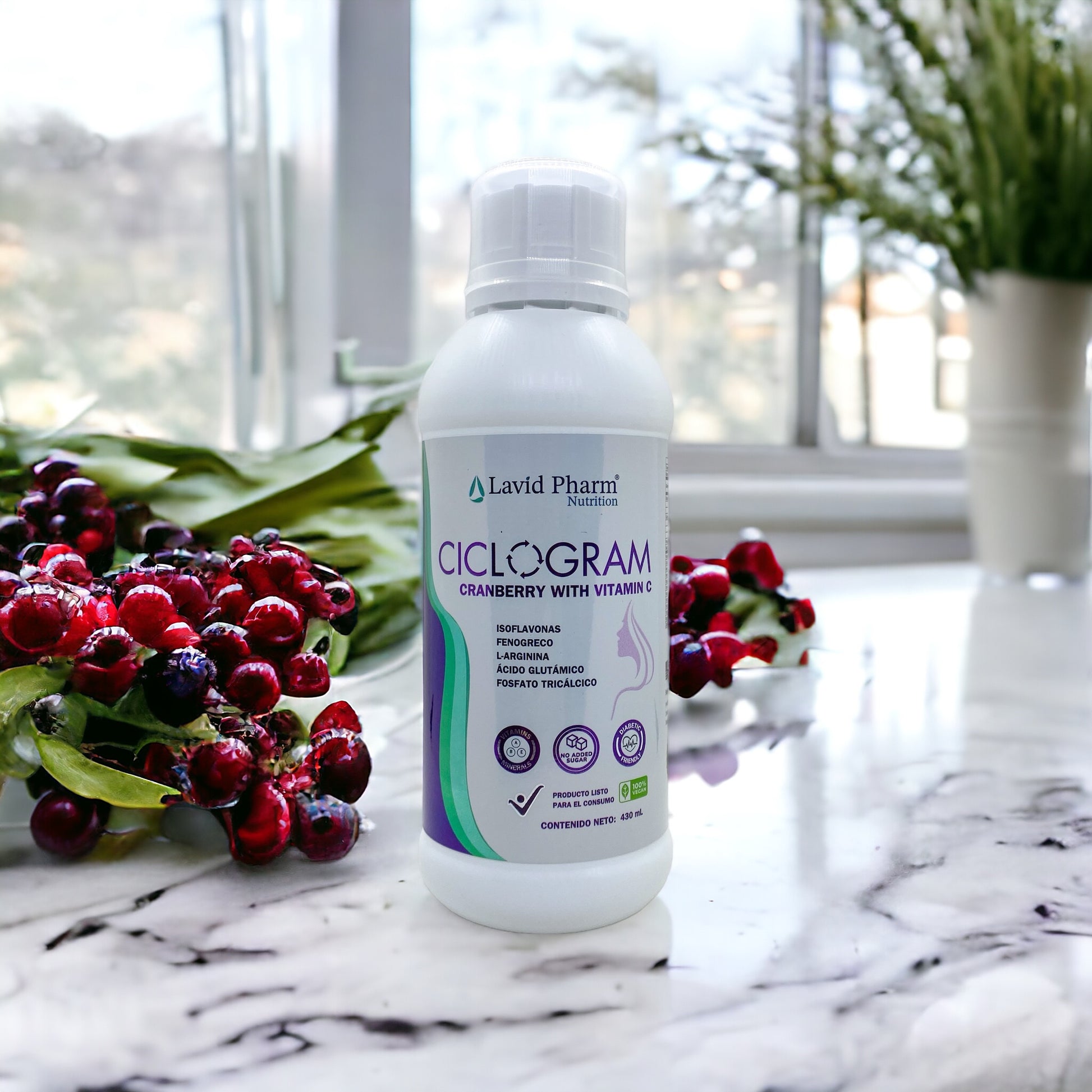 CICLOGRAM es una bebida funcional a base de agua y malta líquida, sin azúcar añadida, con arándano y delicioso sabor a frutos rojos. Su fórmula exclusiva está diseñada para favorecer un microbioma femenino saludable, gracias a la sinergia de Cranberry, Lecithin Extract and Soy Isoflavones, Fenogreco, L-Arginina, Vitamina C, Zinc y Ácido Glutámico, elaborados con materias primas americanas de alta calidad.