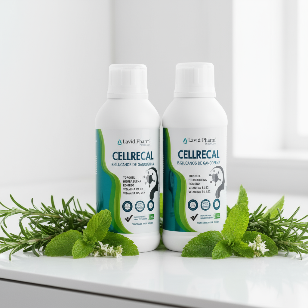 CELLRECAL es una bebida funcional a base de agua y malta líquida sin azúcar añadida, enriquecida con extractos naturales de hierbabuena, flor de jamaica y romero, además de β-glucanos de Ganoderma lucidum y vitaminas del complejo B con calcio.