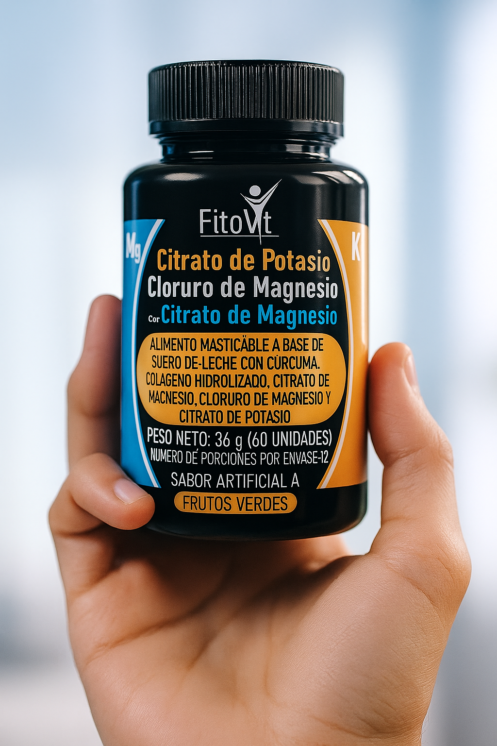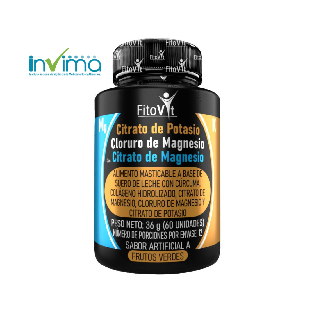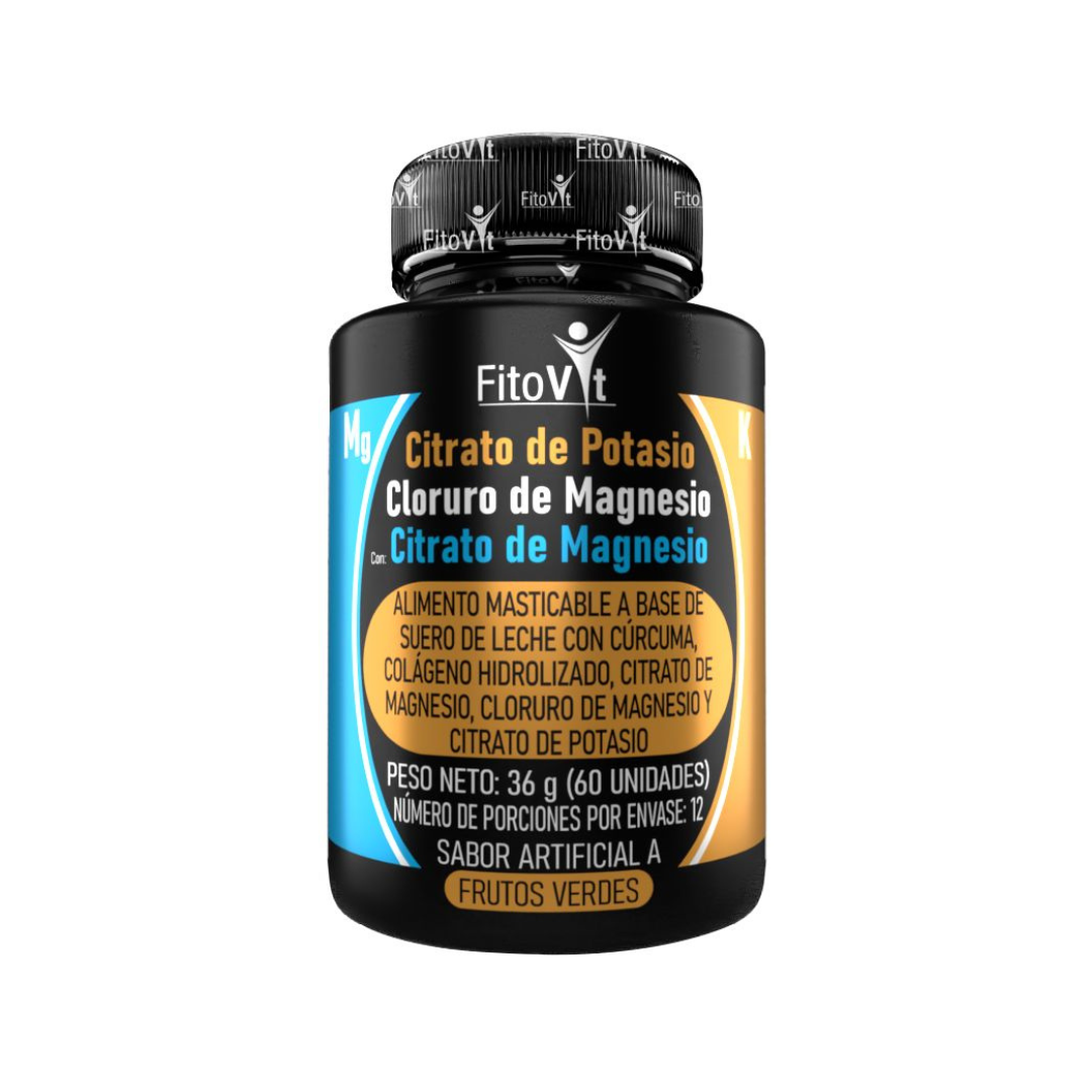 Tabletas masticables con citrato de potasio, magnesio, cúrcuma y colágeno hidrolizado, perfectas para mantener tu cuerpo fuerte, con energía y sin molestias musculares.