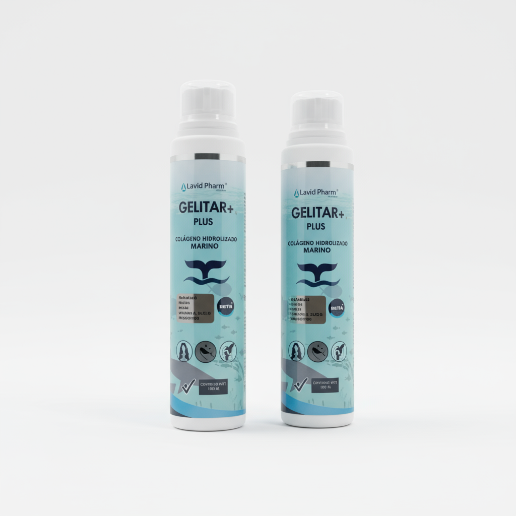 GELITAR + PLUS es una bebida funcional a base de agua y malta líquida, sin azúcar añadida, formulada con Colágeno Marino, Colágeno Hidrolizado, Biotina, Resveratrol, Uva, Pepino, B-glucanos de Ganoderma lucidum y Lactobacillus acidophilus (prebióticos).